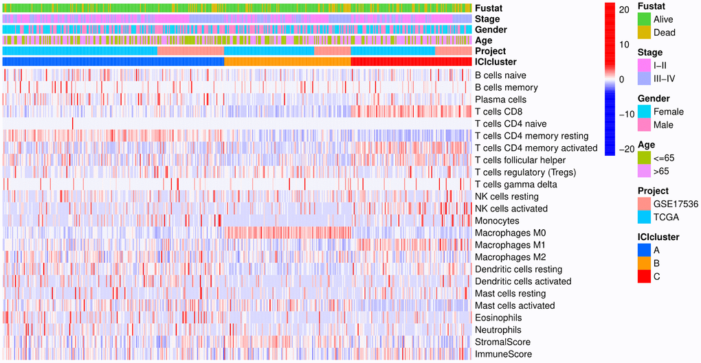 The colon cancer samples were downloaded from TCGA and GSE17536 [23] datasets. In the subsequent analysis, the CIBERSORT and ESTIMATE algorithm were used to quantify the infiltration level of immune cells in colon cancer tissues [24, 25]. The colon cancer patients were divided into three distinct subtypes (ICI clusters A-C) by the K-means algorithm. To analyze the expression of immune cells according to different immune subtypes and clinical characteristics, a heat map of 22 kinds of immune cells associated with different survival statuses, stages, ages and subtypes was drawn (Figure 1).
