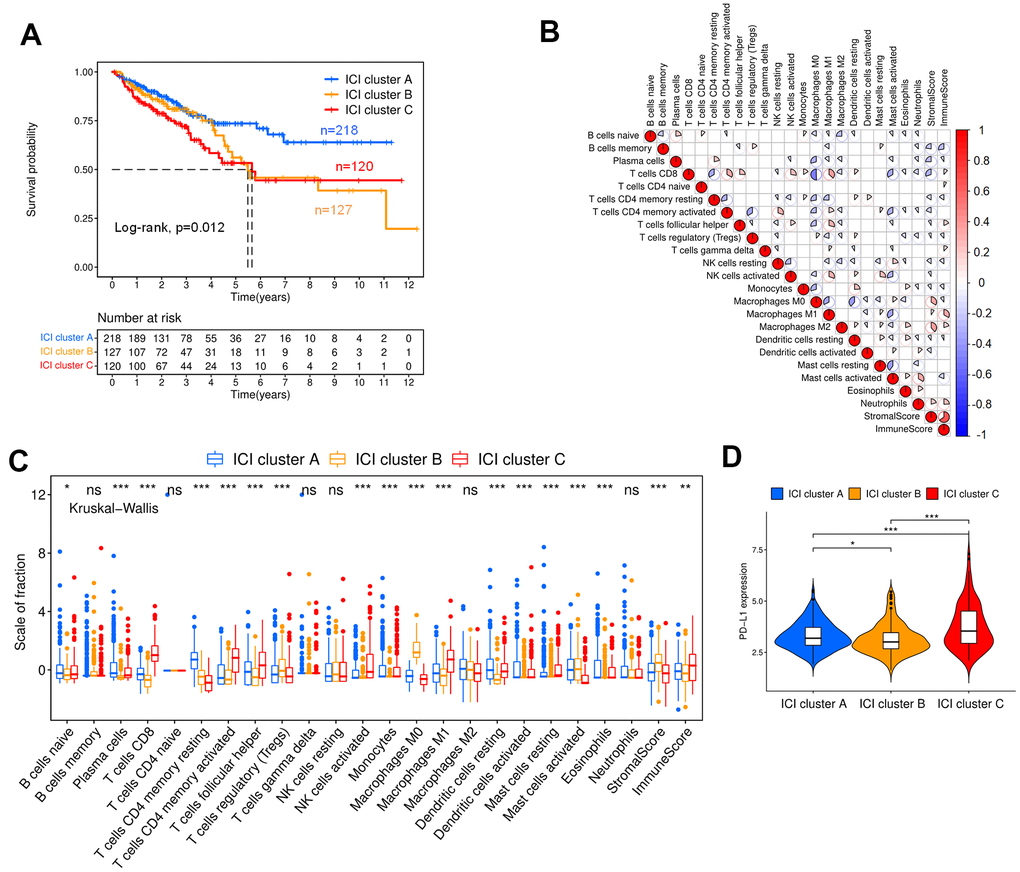 Figure 2A shows the Kaplan-Meier curve for different ICI clusters, and the patients exhibiting these three ICI clusters show statistically significant survival differences (p=0.012). After that, the correlation between immune cells was analyzed, and the results showed that CD8+ T cells had the greatest negative correlation with M0 macrophages and the largest positive correlation with M1 macrophages, the immune scores and stromal scores were negatively correlated with macrophages (Figure 2B). Figure 2C indicates the difference in immune cell contents in ICI clusters of colon cancer patients. ICI cluster A had the best overall survival (OS) and was marked by the highest fraction of plasma cells, memory resting CD4+ T cells, dendritic cells, monocytes and eosinophils. ICI cluster B exhibited a significant increase in regulatory T cells and M0 macrophages. In contrast, CD8+ T cells, memory-activated CD4+ T cells, follicular helper T cells, activated NK cells, M1 macrophages and resting mast cells have the largest proportions in ICI cluster C. Then, we found that the expression level of PD-L1, an important immune checkpoint molecule for colon cancer, presented a significant difference between different ICI clusters, and ICI cluster C was characterized by the highest expression level with poor prognosis (Figure 2D) [26].