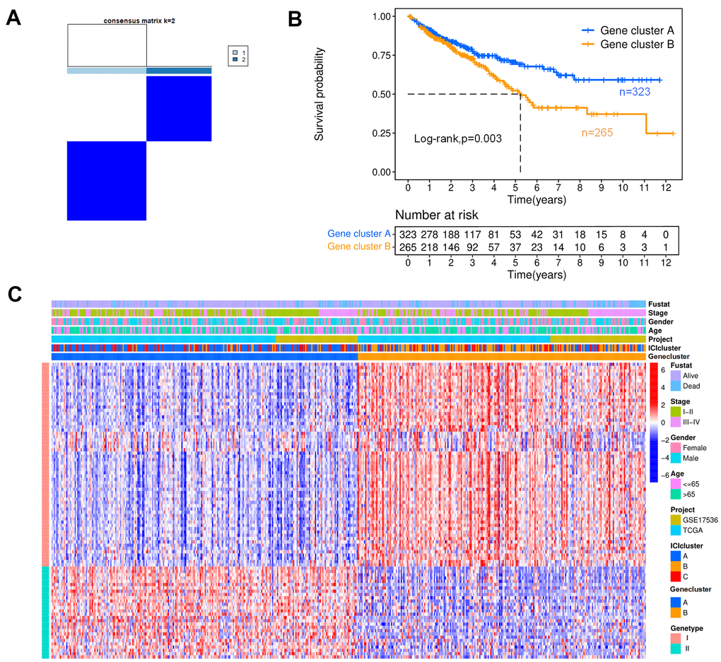 To reveal the potential biological characteristics of distinct subtypes, differentially expressed genes (DEGs) were identified among these ICI clusters by the limma package in R software, and 113 DEGs were obtained. The DEGs positively correlated with the gene cluster were marked as type I, and the rest were designated as type II. According to these DEGs, the colon cancer samples were classified into two groups by the K-means algorithm with small intragroup differences and the large differences between distinct subgroups, as shown in Figure 3A; these two groups were named gene cluster A (n=323) and B (n=265). The Kaplan-Meier curve indicated that the patients with the gene cluster A profile had better OS than those with gene cluster B (Figure 3B, p=0.003). Figure 3C shows the heat map of DEGs with different subgroups and clinical statuses.