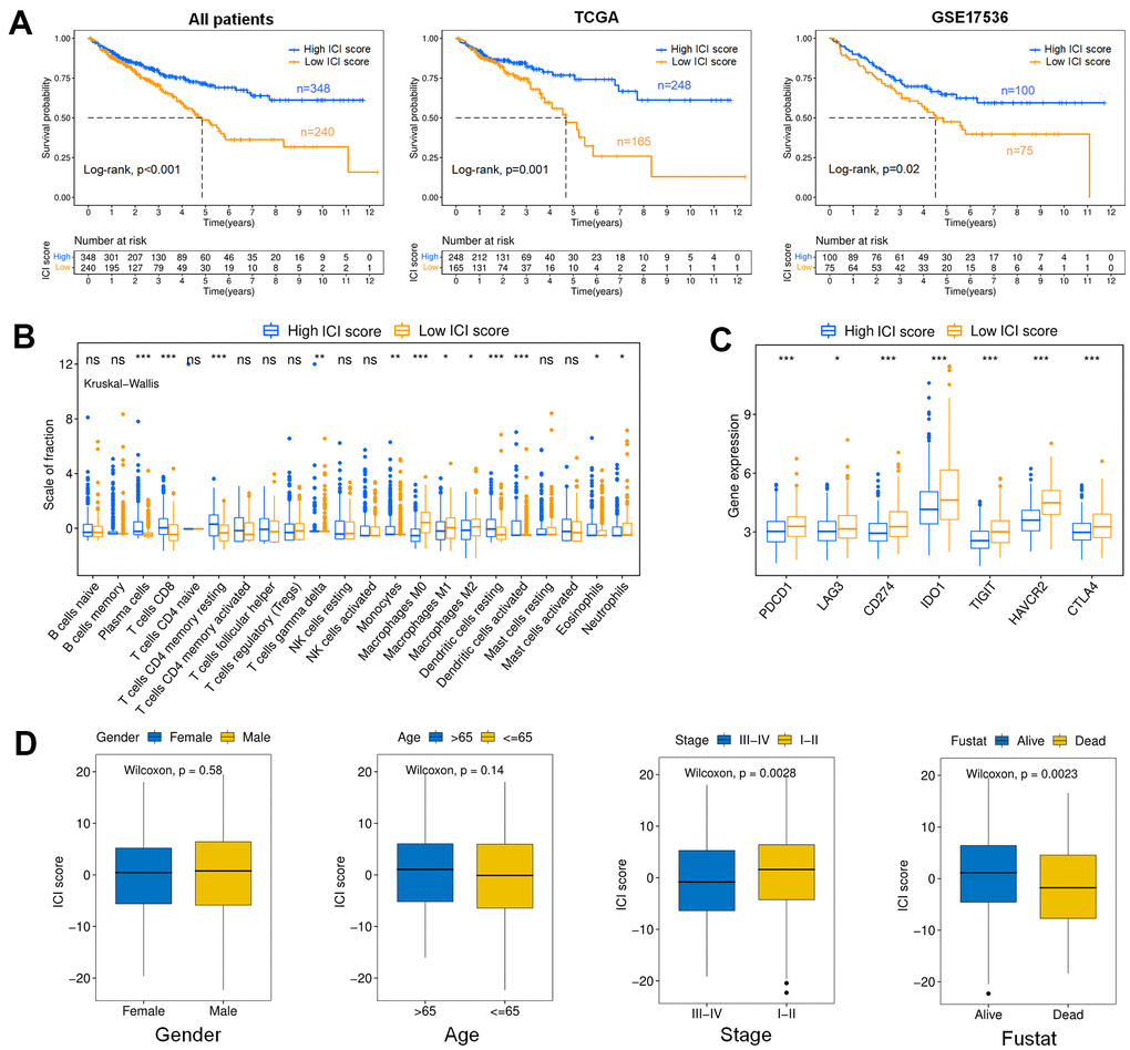 The colon cancer patients could be divided into high (n=348) and low (n=240) ICI score subgroups with the optimal cutoff value. The survival rate of the high ICI score subgroup was significantly higher than that of the low ICI score subgroup at the same time point, suggesting that colon cancer patients with high ICI scores had a better prognosis, as shown in Figure 4A (p<0.001). Moreover, it could be found that there was a significant difference in survival between high and low ICI score patients in TCGA (p=0.001) and GSE17536 (p=0.02), respectively. The high ICI score subtype was marked by a high proportion of plasma cells, CD8+ T cells, memory resting CD4+ T cells, monocytes, dendritic cells and eosinophils. In the low ICI score subtype, macrophages and neutrophils contributed a relatively greater fraction. (Figure 4B). We further analyzed the immune activity of the immune checkpoint relevant molecules in high and low ICI score subgroups (LAG3, PDCD1/PD-1, IDO1, CD274/PD-L1, CTLA-4, TIGHT, HAVCR2) [27, 28]. We found that all immune checkpoint molecules were significantly overexpressed in the low ICI score subgroup, which had poor outcomes (Figure 4C). The ICI score showed statistical differences between alive and dead (p=0.0023), stage I-II and III-IV (p=0.0028) patients, in which surviving and stage I-II patients associated to higher ICI scores, however, there was no obviously difference in gender and age (Figure 4D).