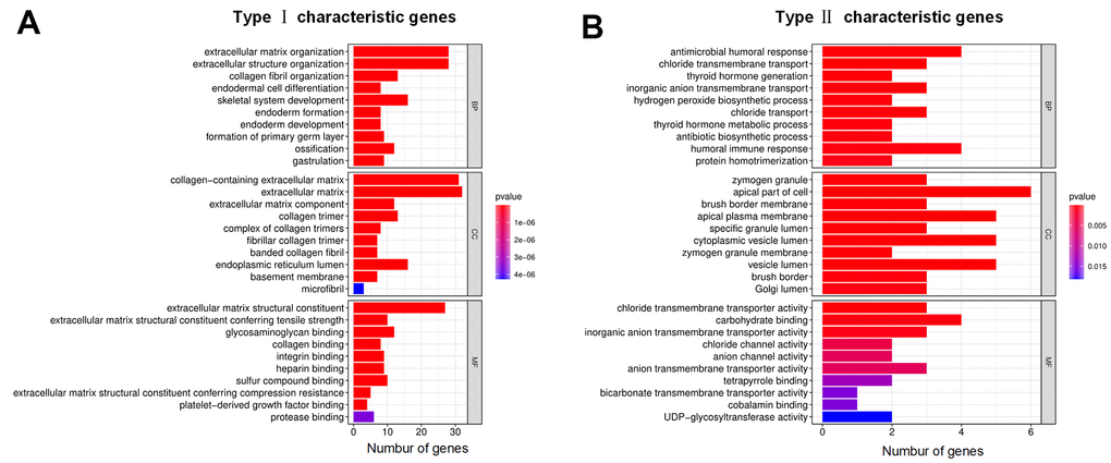 GO functional analysis was carried out to explore the biological functions of ICI DEGs for colon cancer, and bar plots for type I and type II characteristic genes were drawn. The Gene Set Enrichment Analysis (GSEA) of high and low ICI score subgroups was conducted by GSEAv4.1 software (http://www.gsea-msigdb.org/gsea/index.jsp), and the number of permutations was set to 1000.