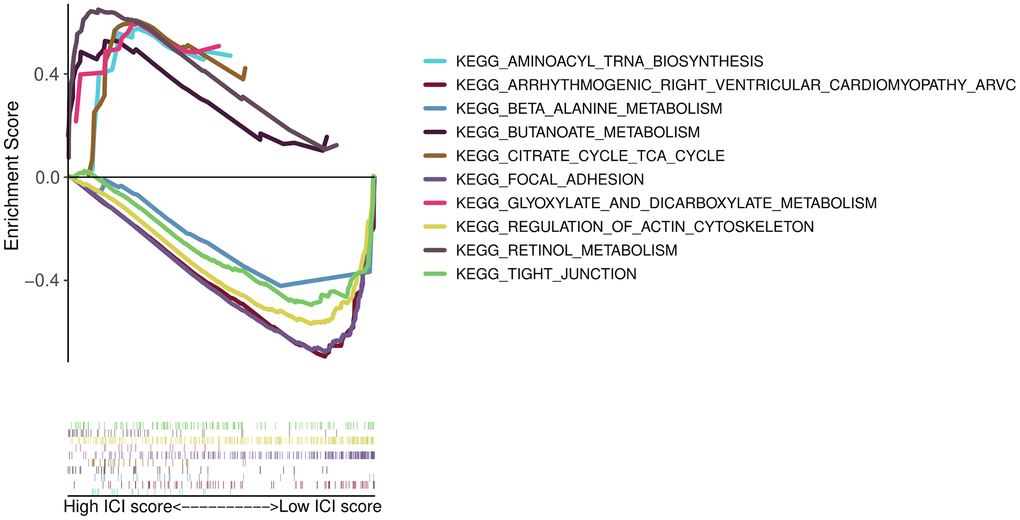 Gene Ontology (GO) enrichment analysis was used to define the different biological functions in different DEG types. The results showed that type I characteristic DEGs were mainly enriched in extracellular matrix, extracellular structure organization, collagen-containing extracellular matrix and extracellular matrix structural constituent (Figure 5A). Type II characteristic DEGs were primarily enriched in antimicrobial humoral response, humoral immune response, apical part of cell and carbohydrate binding (Figure 5B). The results of GSEA showed that aminoacyl tRNA biosynthesis, glyoxylate and dicarboxylate metabolism, butanoate metabolism, citrate cycle/TCA cycle, and retinol metabolism were enriched in the high ICI score subgroup, whereas beta alanine metabolism, tight junction, regulation of actin cytoskeleton, arrhythmogenic right ventricular cardiomyopathy (ARVC), and focal adhesion were enriched in the low ICI score subgroup (Figure 6).