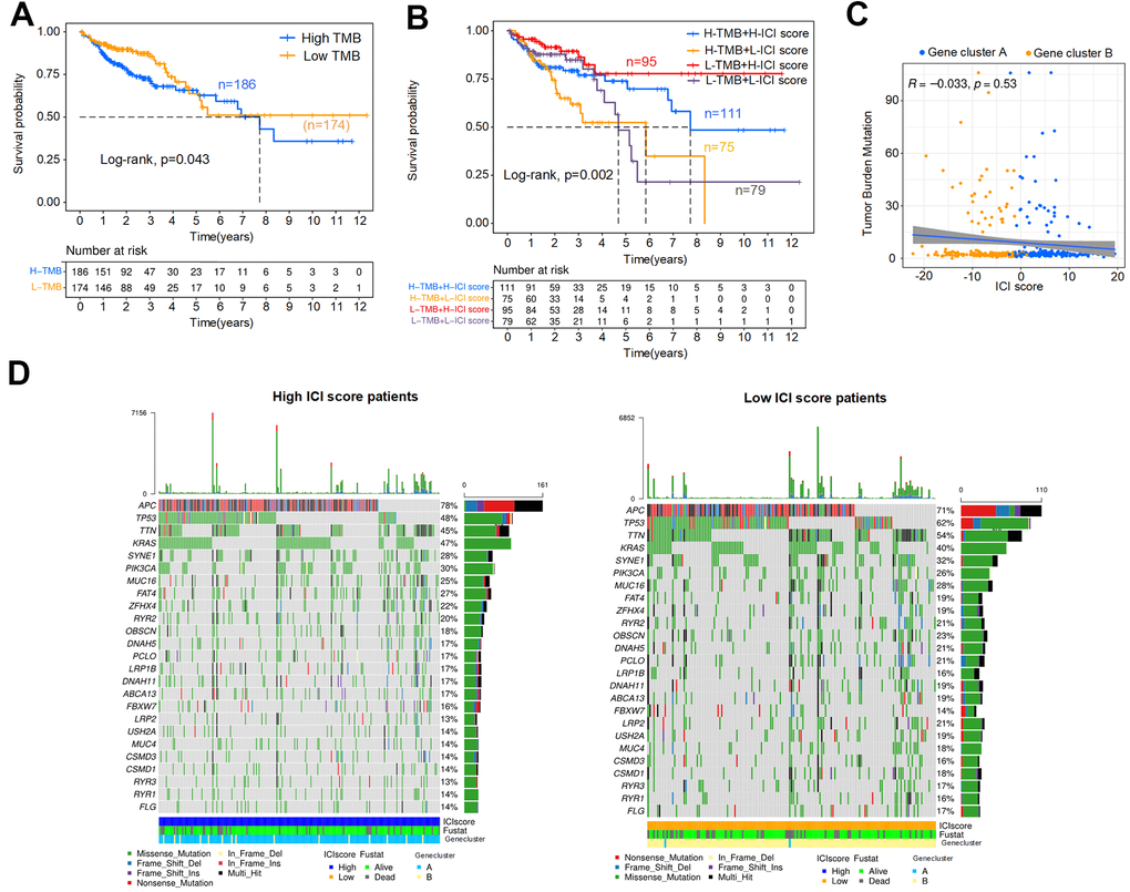 This section analyzed the internal relationship between ICI score and tumor mutation burden (TMB), considering TMB is a potential predictor of response to immune checkpoint inhibitors in MSI-H colon cancer [29]. First, we downloaded the TMB data of colon cancer patients from TCGA database and classified these patients into high (n=186) and low (n=174) TMB subtypes. As shown in Figure 7A, the OS of the low TMB group was better (p=0.043). The Kaplan-Meier curve showed significant differences in OS among the combined subgroups (H-TMB+H-ICI score, H-TMB+L-ICI score, L-TMB+H-ICI score and L-TMB+L-ICI score), and the ICI score subgroups showed significant survival differences in both the high and low TMB subtypes (Figure 7B, p=0.002). Among them, the L-TMB+H-ICI subgroup patients had the best prognosis. To explore the intrinsic relationship between the TMB and ICI scores, difference and correlation analyses were conducted between TMB and ICI scores. The correlation analysis confirmed that the ICI score was not obviously correlated with the TMB, as shown in Figure 7C. Further, the mutation annotation files of TCGA cohort between the high and low ICI score subgroups were analyzed, and the top 25 driver genes with the highest alteration frequency are shown in Figure 7D. These analyses revealed that 8 driver genes (APC, TTN, TP53, KRAS, LRP2, FAT4, OBSCN, LRP2) were clearly different in alteration frequency (the value of difference >= 7%) between the two ICI score subgroups, but only TP53 showed a statistically significant difference (Table 1).