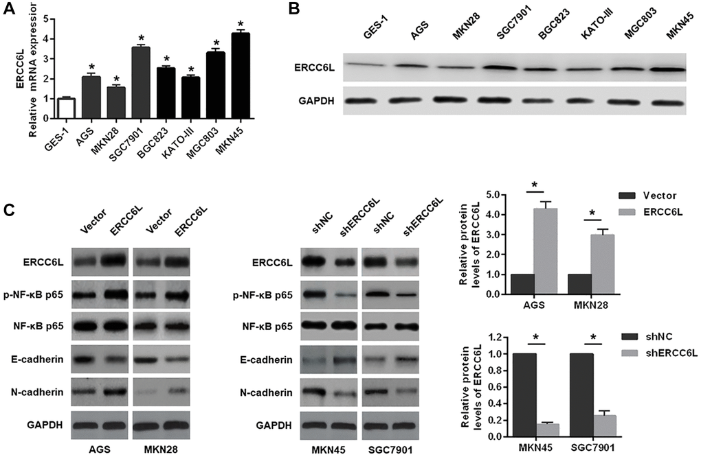 Compared with GES-1, the mRNA and protein expressions of ERCC6L were significantly elevated in GC cells (AGS, MKN28, SGC7901, BGC823, KATO-III, MGC803 and MKN45) (Figure 2A and 2B). Subsequently, we found that ERCC6L overexpression increased p-NF-κB p65 and N-cadherin expression levels, and decreased E-cadherin expression in AGS cells and MKN28 cells. On the contrary, ERCC6L downregulation in MKN45 and SGC7901 cells led to the opposite outcomes (Figure 2C).
