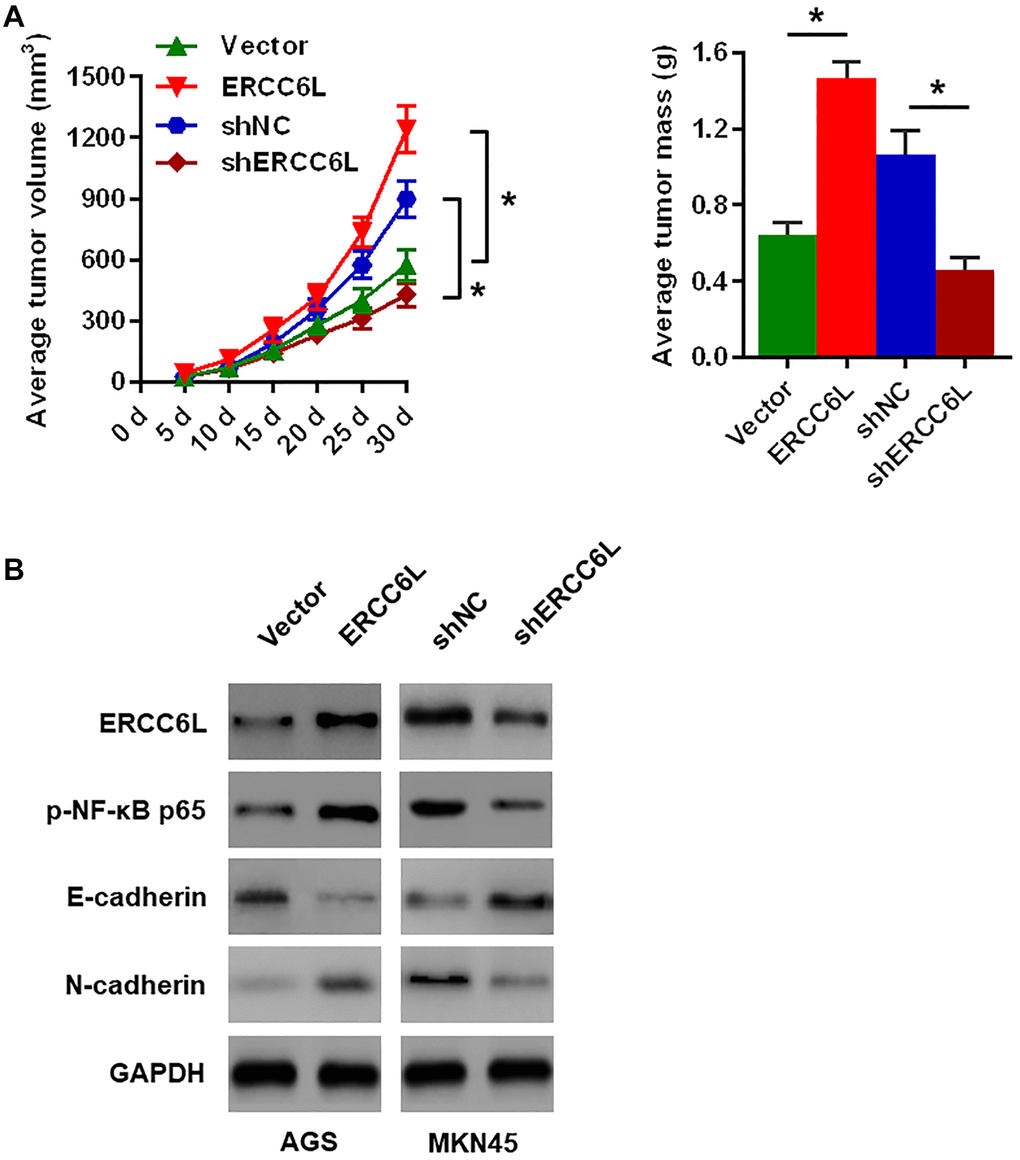 These results demonstrated ERCC6L overexpression in AGS cells markedly promoted cell proliferation on the basis of the volume and weight of the transplanted tumor (Figure 4A). The Western blot analysis of the xenograft tissues revealed that ERCC6L overexpression in AGS cells resulted in higher levels of Ki-67, p-NF-κB p65 and N-cadherin, and lower E-cadherin level (Figure 4B). Conversely, ERCC6L knockdown in MKN45 cells accomplished exactly the opposite (Figure 4A–4B).