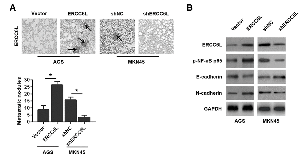 In addition, the result revealed that ERCC6L overexpression in AGS cell promoted lung metastasis, as evidenced by the more pulmonary metastases (Figure 5A) and EMT reversal (Figure 5B). As expected, ERCC6L downregulation in MKN45 cells resulted in a significantly opposite effect on cell proliferation and metastasis in vivo (Figure 5A–5B).
