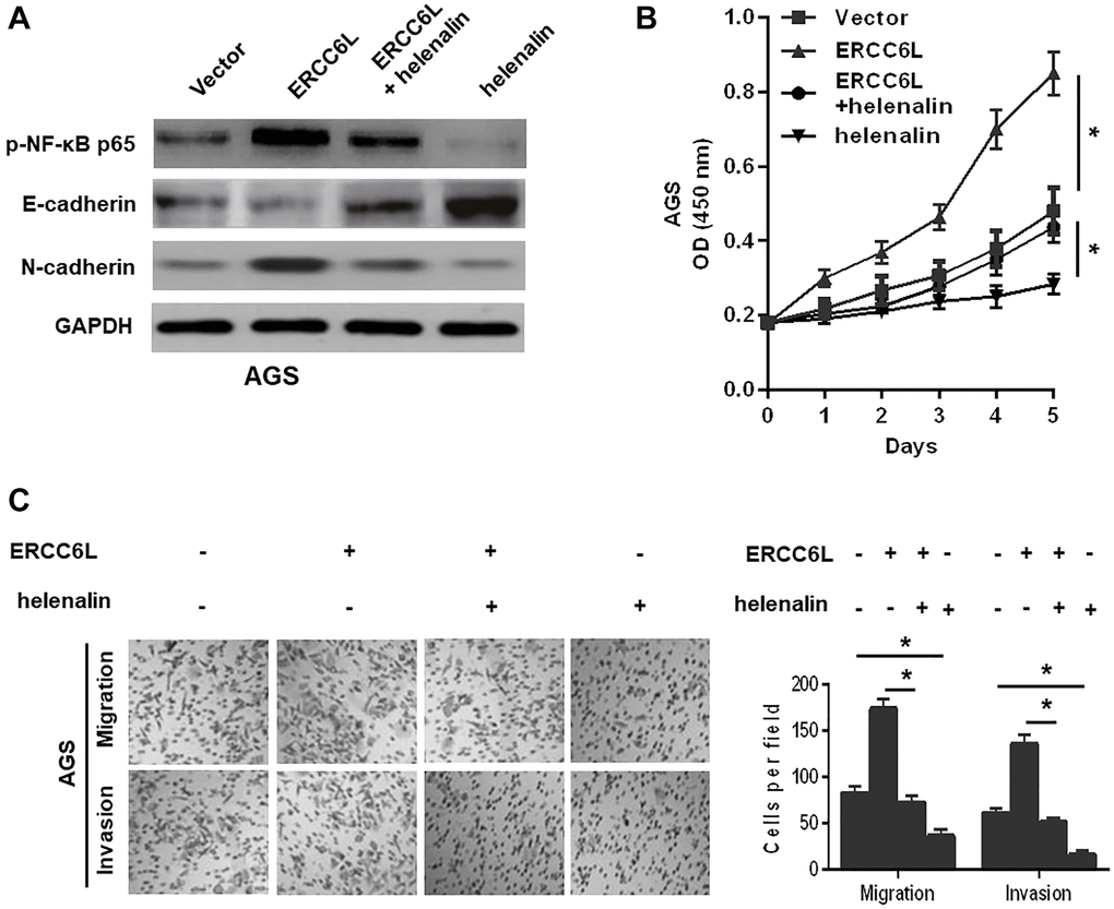 The NF-κB signaling pathway is responsible for in tumor progression [9]. We reasoned that ERCC6L might promote EMT by activating NF-κB pathway in GC. We revealed that ERCC6L overexpression increased the levels of p-NF-κB p65 and N-cadherin; whereas, ERCC6L knockdown decreased their levels. To explore whether NF-κB signaling pathway involved in ERCC6L-induced cellular changes, helenalin, the inhibitor of NF-κB, was used. The results showed that helenalin could reverse EMT, decrease p-NF-κB p65 (Figure 6A) and suppress cell growth (Figure 6B), migration and invasion (Figure 6C) induced by ERCC6L. Altogether, these data demonstrated that NF-κB pathway-mediated EMT was involved in the ERCC6L-induced oncogenic function.