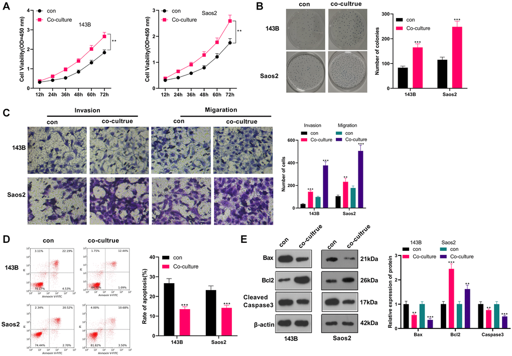We co-cultured IL-4/13-induced M2-TAMs with human OS cells (143B and Saos2) to probe the influence of M2-TAMs on OS cell growth and metastasis. CCK-8 was adopted to test cell viability at different times (12, 24, 36, 48, 60, and 72 hours). As a result, by contrast with the control group, 143B and Saos2 cell viability in the co-culture group was strengthened (P < 0.05, Figure 1A). As per the results displayed in the colony formation assay, 143B and Saos2 cell proliferation was strengthened in the co-culture group (P < 0.05, Figure 1B). Moreover, the Transwell assay testified that cell migration and invasion were heightened in the co-culture group (P < 0.05, Figure 1C). As indicated by FCM results, the co-culture group had reduced cell apoptosis (vs. the control group) (P < 0.05, Figure 1D). Besides, WB results uncovered that Bax and Cleaved Caspase-3 were choked, while Bcl2 was boosted in the co-culture group (vs. the control group) (P < 0.05, Figure 1E). These findings illustrated that M2-TAMs amplified 143B and Saos2 cells’ growth, proliferation, migration and invasion and impeded apoptosis.