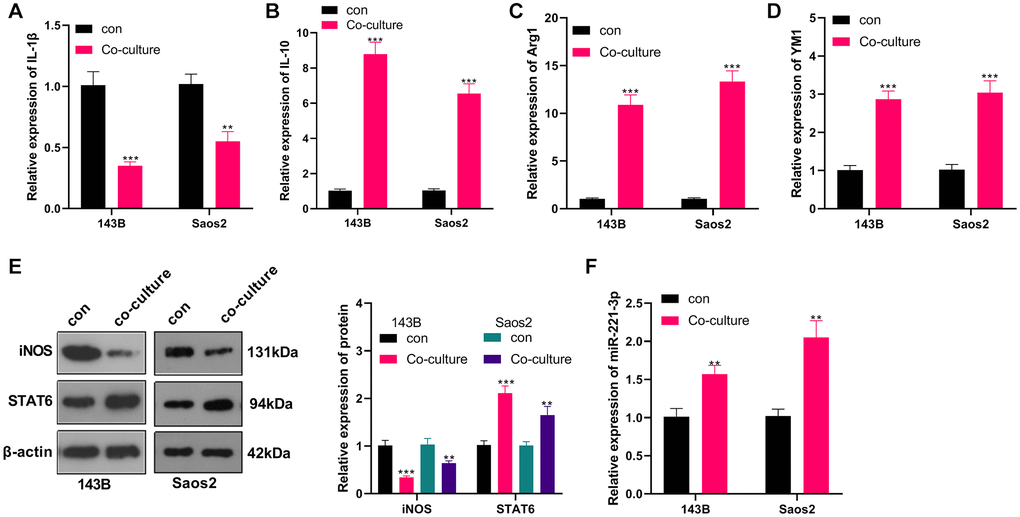M2-TAMs were co-cultured with OS cells, and we conducted qRT-PCR to verify the profiles of macrophage polarization markers IL-1, IL-10, Arg1, and YM1 in M2-TAMs. The results revealed IL-1β was down-regulated, while IL-10, Arg1 and YM1 levels were augmented in the co-culture group (vs. the control group) (P < 0.05, Figure 2A–2D). Meanwhile, WB testified that by contrast with the control group, iNOS expression was abated and STAT6 expression was elevated in the co-cultured group (P < 0.05, Figure 2E). Besides, qRT-PCR uncovered that the miR-221-3p profile was heightened in the co-culture group (P < 0.05, Figure 2F). Up-regulated miR-221 predicted poorer overall survival of OS patients (Supplementary Figure 1). These findings hinted that the co-culture of 143B and Saos2 cells with TAMs enhanced the “M2” polarization and miR-221-3p profiles.