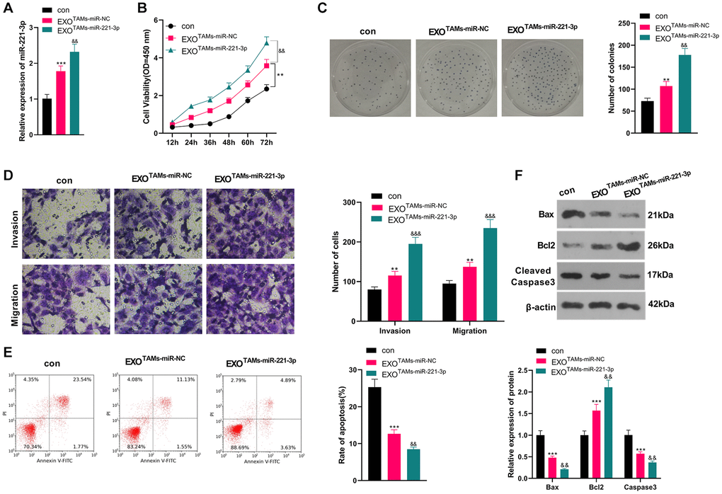 We transfected miR-221-3p mimics into M2-TAMs. Then we isolated the exosomes from M2-TAMs and treated Saos2 cells with the exosomes. miR-221-3p was enhanced in THP1 cells as well as the exosomes after miR-221-3p transfection (vs. miR-NC group, Supplementary Figure 2A–2E). qRT-PCR outcomes confirmed that miR-221-3p expression was facilitated in the EXOTAMs+miR-221-3p group (vs. the EXOTAMs+miR-NC group) (P < 0.05, Figure 3A). CCK-8 assay confirmed that Saos2 cell viability was enhanced in the EXOTAMs+miR-221-3p group (vs. the EXOTAMs+miR-NC group) (P < 0.05, Figure 3B). Additionally, the colony formation assay uncovered that cell proliferation in the EXOTAMs+miR-221-3p group was increased (vs. the EXOTAMs+miR-NC group) (P < 0.05, Figure 3C). Besides, the Transwell assay demonstrated that the cell migrative and invasive capacities of the EXOTAMs+miR-221-3p group were strengthened (vs. the EXOTAMs+miR-NC group) (P < 0.05, Figure 3D). What’s more, FCM hinted that cell apoptosis was hindered in the EXOTAMs+miR-221-3p group (vs. the EXOTAMs+miR-NC group) (P < 0.05, Figure 3E). Also, WB disclosed that the contents of Bax and Cleaved Caspase-3 in the EXOTAMs+miR-221-3p group were impeded, and the Bcl2 profile was boosted (vs. the EXOTAMs+miR-NC group) (P < 0.05, Figure 3F). These conclusions suggested that miR-221-3p overexpression facilitated the growth, proliferation, migration and invasion, and hampered apoptosis of Saos2 cells.