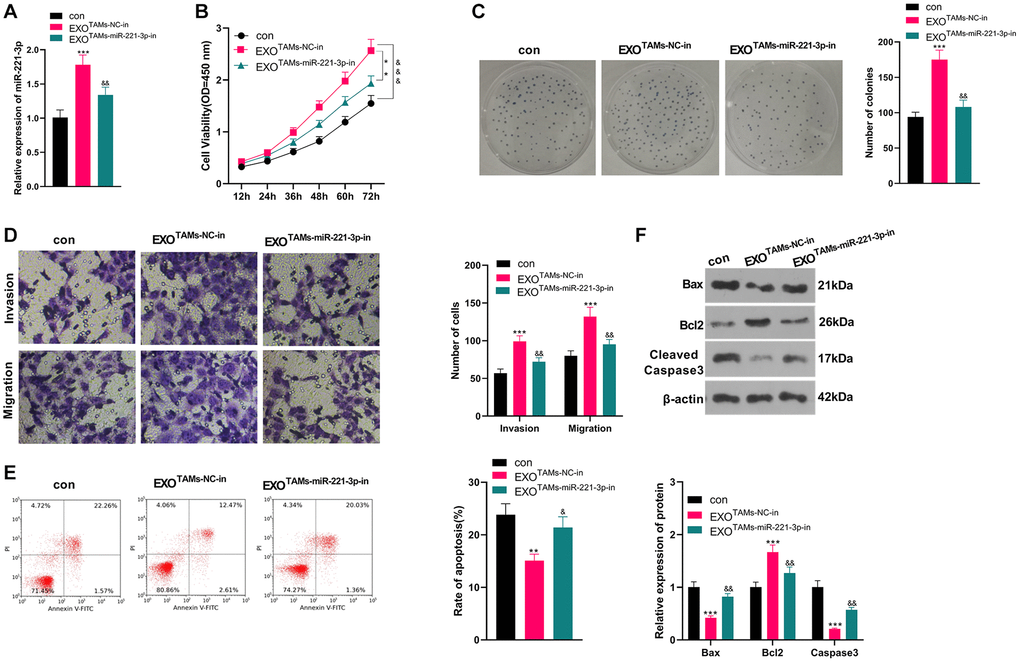 We transfected miR-221-3p-in into M2-TAMs. Then we isolated the exosomes from M2-TAMs and treated Saos2 cells with the exosomes. miR-221-3p expression declined in THP1 cells as well as the exosomes after the miR-221-3p-in transfection (vs. NC-in group, Supplementary Figure 2A–2E). qRT-PCR manifested that miR-221-3p expression was hindered in the EXOTAMs+miR-221-3p-in group (vs. the EXOTAMs+NC-in group) (P < 0.05, Figure 4A). As indicated by CCK-8 outcomes, by contrast with the TAMs+NC-in group, cell viability of the TAMs+miR-221-3p-in group was hampered (P < 0.05, Figure 4B). Moreover, the colony formation assay illustrated that cell proliferation in the EXOTAMs+miR-221-3p-in group was curbed (vs. the EXOTAMs+NC-in group) (P < 0.05, Figure 4C). Furthermore, the Transwell assay testified that the EXOTAMs+miR-221-3p-in group had weakened cell migration and invasion (vs. the EXOTAMs+NC-in group) (P < 0.05, Figure 4D). Meanwhile, FCM results uncovered that the EXOTAMs+miR-221-3p-in group had intensified cell apoptosis (vs. the EXOTAMs+NC-in group) (P < 0.05, Figure 4E). Also, WB confirmed that the concentrations of Bax and Cleaved Caspase-3 in the EXOTAMs+miR-221-3p-in group were boosted, while the Bcl2 level was hindered (vs. EXOTAMs+NC-in group) (P < 0.05, Figure 4F). In summary, miR-221-3p knockdown in M2-TAM exosomes impeded Saos2 cell growth, proliferation, migration and invasion, and stimulated apoptosis.