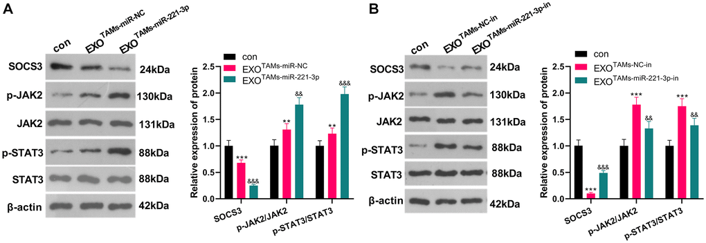 miR-221-3p mimics, inhibitors and their negative controls were respectively transfected into M2-TAMs. Then we isolated the exosomes from M2-TAMs and treated Saos2 cells with the exosomes. The SOCS3/JAK2/STAT3 axis was detected by WB. As a result, SOCS3 was down-regulated, and the JAK2/STAT3 phosphorylation was strengthened in the EXOTAMs+miR-221-3p group (vs. the EXOTAMs+miR-NC group) (Figure 6A, P < 0.05). On the contrary, SOCS3 level was enhanced and the JAK2/STAT3 phosphorylation was repressed after EXOTAMs+miR-221-3p-in treatment (vs. the EXOTAMs+NC-in group) (Figure 6B, P < 0.05). These findings indicated that miR-221-3p enriched by M2-TAM exosomes dampened the SOCS3 expression and activated JAK2/STAT3 in OS cells.