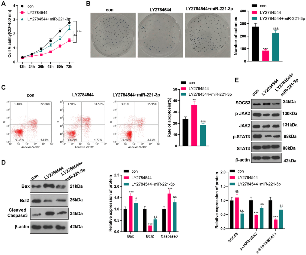 To confirm the role of JAK2/STAT3 in OS cells, we treated OS cells (Saos2) with the JAK2/STAT3 pathway inhibitor LY2784544. Then miR-221-3p mimics were transferred into OS cells. CCK-8 and colony formation assay showed that Saos2 cells’ viability and proliferation in the LY2784544 group were decreased (vs. the control group). However, by contrast with the LY2784544 group, the LY2784544 +miR-221-3p group showed elevated cell viability (Figure 7A–7B, P < 0.05). Also, FCM testified that cell apoptosis was heightened in the LY2784544 group (vs. the control group) and was abated in the LY2784544 +miR-221-3p group (vs. the LY2784544 group) (Figure 7C, P < 0.05). Moreover, WB verified that Bax and Cleaved Caspase-3 expression was amplified, while Bcl2 was choked in the LY2784544 group (vs. the control group). On the contrary, opposite results were monitored in the LY2784544 +miR-221-3p group (vs. the LY2784544 group) (Figure 7D, P < 0.05). Besides, the SOCS3/JAK2/STAT3 pathway expression was detected by WB. It turned out that the activation of JAK2/STAT3 in the LY2784544 group was decreased, but the SOCS3 level remained unchanged (vs. the control group). In contrast, the JAK2/STAT3 phosphorylation in the LY2784544 +miR-221-3p group was enhanced, but the SOCS3 level was lowered (vs. the LY2784544 group) (Figure 7E, P < 0.05). These findings demonstrated that inhibiting JAK2/STAT3 reduced the malignant behaviors of OS cells, and miR-221-3p reversed the anti-tumor function of LY2784544.