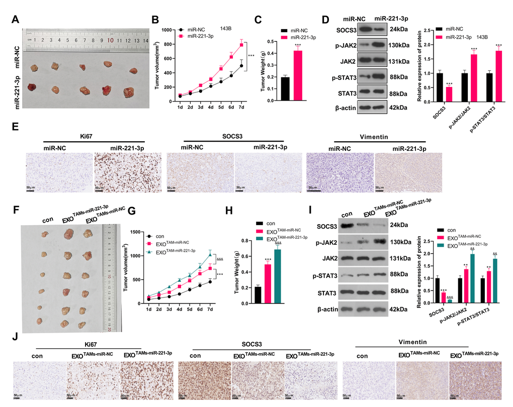 We subcutaneously injected miR-221-3p mimics or M2-TAM exosomes overexpressing miR-221-3p into tumor-bearing mice and observed the tumor growth in vivo. We found that by contrast with the miR-NC group, the tumor volume and mass of the miR-221-3p group increased significantly (Figure 8A–8C, P < 0.05). WB and IHC were employed to verify the SOCS3/JAK2/STAT3 expression in the tumor tissues of mice. The results revealed that SOCS3 was down-regulated, while Ki-67 positive cells were increased and JAK2/STAT3 was facilitated in the miR-221-3p group (vs. the miR-NC group) (Figure 8D–8E, P < 0.05). Additionally, the EXOTAMs-miR-221-3p injection promoted tumor growth and increased tumor weight (vs. EXOTAMs-miR-NC group, Figure 8F–8H). The results of ICH and WB suggested that EXOTAMs-miR-221-3p injection reduced SOCS3 and promoted JAK2/STAT3 pathway activation (vs. EXOTAMs-miR-NC group, Figure 8I–8J). interestingly, EXOTAMs-miR-221-3p injection also enhanced Ki67 positive cell rate (vs. EXOTAMs-miR-NC group, Figure 8J). In summary, miR-221-3p exerted oncogenic effects in vivo.