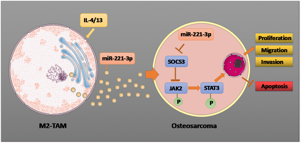 In a nutshell, this research confirmed that miR-221-3p produced by IL-4/13-induced M2-TAM exosomes significantly enhances the malignant progression of OS cells. Further mechanism researches uncovered that exosomal miR-221-3p targets the downstream SOCS3 molecules and up-regulates JAK2/STAT3 to affect OS progression (Figure 9). Overall, this article brings a new idea for the clinical therapy of OS, and miR-221-3p is an underlying target for treating OS. However, miR-221-3p’s function in regulating the JAK2/STAT3 pathway in OS patients has not been verified clinically. Further verification will be conducted in subsequent clinical studies.