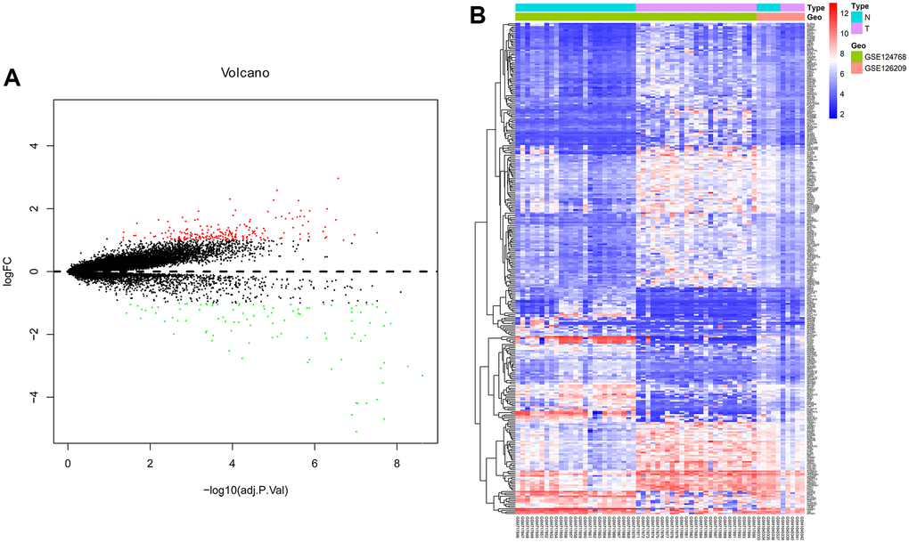 To identify significantly DEMs and DEGs taken part in the development of OS, R software was used to research the gene expression profiles from the GSE124768 and GSE126209. Based on the cut-off criteria (adj.P.Val<0.05 and |log2FC|≥1), 352 differentially expressed mRNAs were identified, including 207 upregulated mRNAs and 145 downregulated mRNAs. upregulated (red) and downregulated (blue) mRNAs between OS cells and healthy donor cells were separately shown on the volcano plot and heatmap respectively (Figure 1).