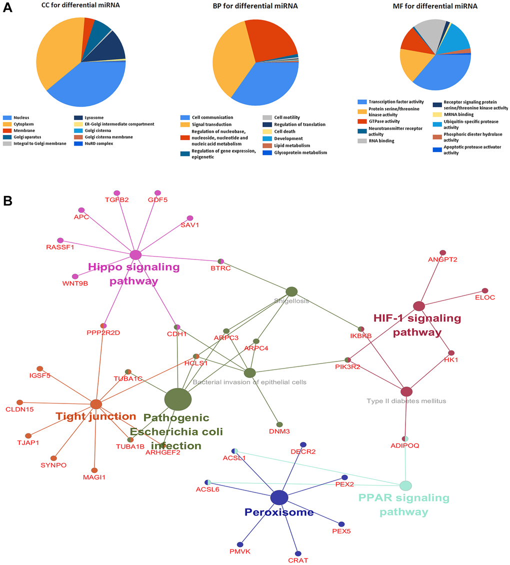 mRNAs were uploaded into FunRich to conduct GO analysis. The result indicated that differentially expressed mRNAs were most enriched in the cytoplasm, nucleoside, mRNA binding, cell communication, signal transduction and cell communication, and transcription factor activity (Figure 2A). KEGG pathway analysis showed that these potential target genes were mainly enriched in 6 pathways including the PPAR signaling pathway, Peroxisome, Hippo signaling pathway, Tight junction, HIF-1 signaling pathway, and Pathogenic Escherichia coli infection (Figure 2B). According to previous studies, their Functional category, cell location, and signaling pathways are associated with the development of diverse malignant tumors.