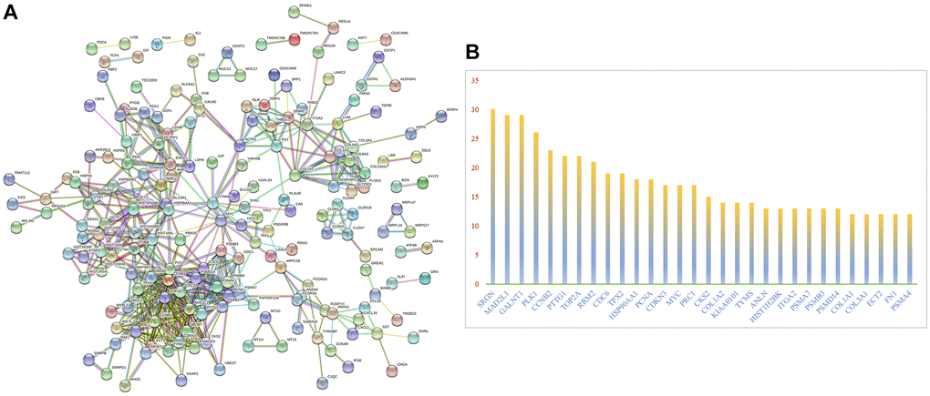 Protein-protein interaction network (PPI) is a network composed of proteins through interaction, which is involved in biological signal transmission, gene expression regulation, energy and material metabolism, cell cycle regulation and other aspects of life processes. Systematic research of protein-protein interactions in biological systems is vital to understand the working principle of proteins in biological systems, understand the reaction mechanism of biological signals and energy metabolism under special physiological conditions, and understand the functional relationship between proteins. 352 genes were entered into the String website to get a PPI network (Figure 3A). In the PPI network, we studied the number of nodes corresponding to each protein including SRGN, MAD2L1, GLANT1, PLK1, PTTG1, CCNB2, and TOP2A. In addition, we draw the histogram of the frequency of the selected gene nodes (Figure 3B). SRGN has the highest number of nodes, so we chose it as the object of further study.