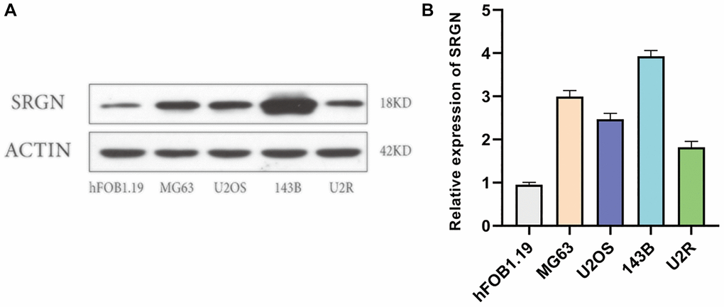 In previous studies, we have found that SRGN expression is upregulated in many tumors, such as NSCLC [17], BC [11, 12], and CRC [13]. Unfortunately, whether SRGN expression is upregulated in osteosarcoma cells as in other tumors has not been reported. To explore the expression of SRGN in OS cells, qRT-PCR and Western-blot assays were used to analyze the expression levels of SRGN at mRNA and protein levels. In the cell line shown in Figure 4, hFOB 1.19 is a human osteoblast, which serves as a control group, other cells such as 143B, U2OS, MG63, and U2R are human osteosarcoma cell lines. The results showed that SRGN expression was the highest in 143B cells at both mRNA level and protein level, while the expression of SRGN in other OS cell lines was lower than that in 143B cells (Figure 4), and the expression of SRGN in all OS cell lines was higher than that in normal human osteoblasts (hFOB1.19).