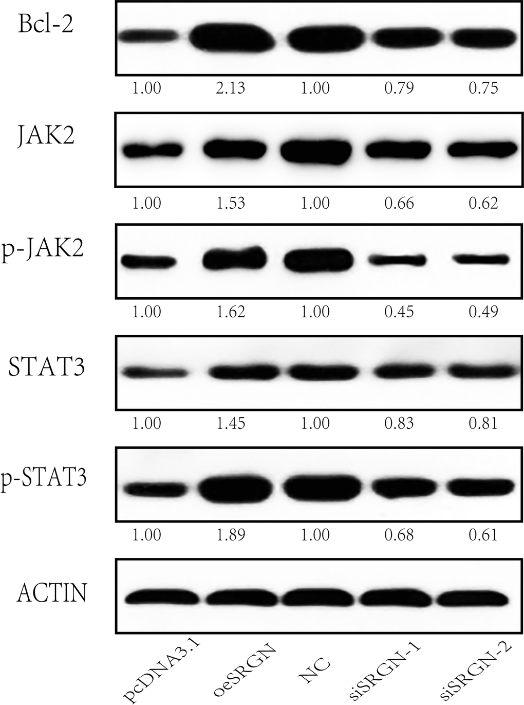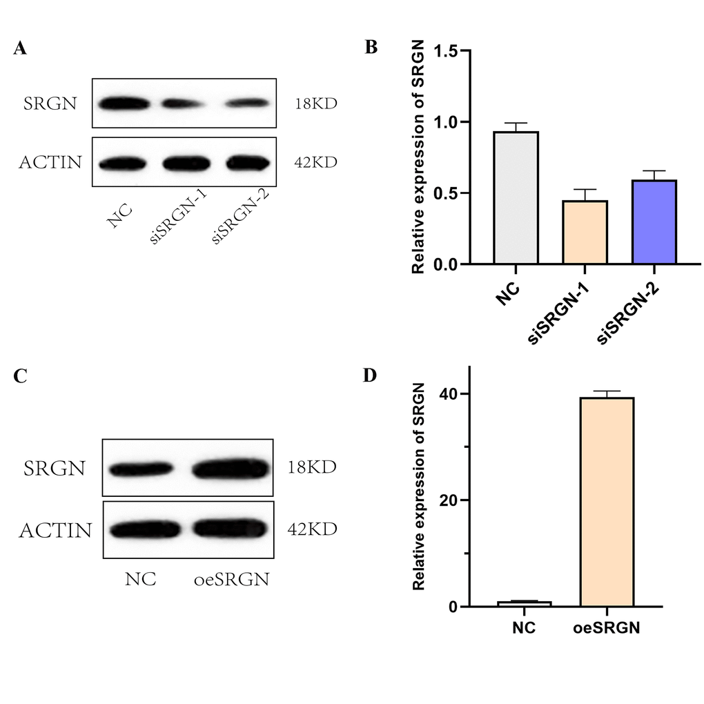 Wash the cells several times with PBS, then RIPA buffer containing protease inhibitors was added to the cell culture dish and placed on ice to lyse the cells for 30 minutes. Then centrifuge at 12000g at 4°C for 25 minutes. Then we measured the protein concentration with BCA protein analysis kit (Pierce, Rockford, IL, USA). Proteins were separated on 10% SDS-PAGE electrophoresed and transferred to PVDF membrane (polyvinylidene fluoride, Millipore, USA). The PVDF membrane was sealed for 1 hour with 5% skim milk at room temperature. Afterward, the membrane and the corresponding antibody were incubated at 4°C overnight (The order number of SRGN is NBP1-80886). The next day, the membrane was washed with PBST three times and incubated with corresponding secondary antibody for 1 hour, then washed three times with PBST and developed with ECL kit. β-actin is the internal control.