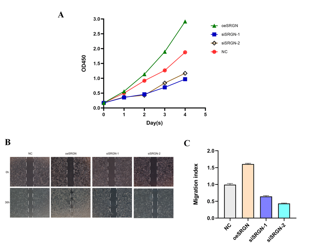Based on the previous results, we selected 143B cells for next assays. We transfected SRGN plasmid, siSRGN-1, and siSRGN-2 into 143B cells, respectively. Figure 5A and 5B showed that the expression of SRGN in siRNA transfected cells was significantly lower than that in NC cells, which was the same at different expression levels. The results indicated that these siRNAs can reduce the expression of SRGN in 143B cells. Similarly, we also detected the overexpression efficiency of SRGN in 143B cells by Western blot and qRT-PCR assays, as shown in Figure 5C and 5D. Previous researches have shown that the high expression of SRGN in other tumors promotes its tumor aggressiveness and proliferation. To investigate whether SRGN promoted or reduced the proliferation of 143B cells, we conducted the CCK-8 assay, as shown in Figure 6A, overexpression of SRGN (oeSRGN) could enhance the proliferation of 143B cells, while od value of the two knockdown groups was lower than that of the control group. In wound healing assays (Figure 6B and 6C), The results showed that the healing speed of SRGN overexpressed cells was the fastest at 36 h, while the healing speed of siSRGN-1 and siSRGN-2 transfected cells was significantly slower than that of NC cells. Therefore, SRGN can promote the proliferation of 143B cells.