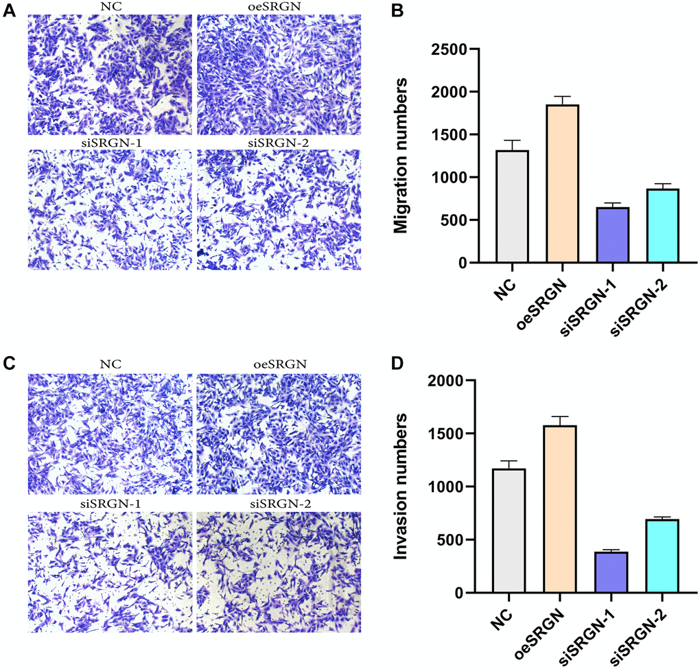 We transfected SRGN plasmid, siSRGN-1, and siSRGN-2 into 143B cells respectively, and carried out scratch, migration, and invasion assays. In the Transwell assays, from Figure 7, we found that compared with NC cells, the migration and invasion ability of SRGN overexpressed cells was enhanced, while the invasion ability of siSRGN-1 and siSRGN-2 transfected cells was significantly reduced. These results showed that overexpression of SRGN could enhance the aggressiveness and repairability of 143B cells, while the aggressiveness of 143B cells was significantly lower than that of NC cells after SRGN was knocked down.