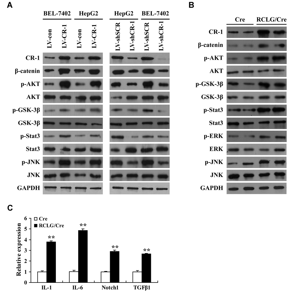 We then comprehensively analyzed the status of several molecular signaling pathways in CR-1-overexpressing and CR-1-silenced HCC cells as well as control and CR-1-overexpressing mouse hepatocytes. CR-1-overexpressing BEL-7402 and HepG2 cells showed significantly higher levels of p-AKT, p-GSK-3β, p-JNK and p-Stat3 compared to the corresponding controls (Figure 5A). This suggested that AKT, JNK and Stat3 signaling pathways were activated in CR-1-overexpressing HCC cells. Conversely, p-AKT, p-GSK-3β, p-Stat3 and p-JNK levels were significantly downregulated in CR-1-silenced BEL-7402 and HepG2 cells compared to their corresponding controls (Figure 5A). We also observed elevated levels of p-AKT, p-GSK-3β, p-Stat3, p-ERK and p-JNK in the liver tissues of RCLG/Alb-Cre transgenic mice compared to those from littermate controls (Figure 5B). β-catenin levels were significantly increased in the CR-1-overexpressing HCC cells (Figure 5A) and the liver tissues of RCLG/Alb-Cre mice (Figure 5B), but were significantly reduced in CR-1-silenced HCC cells (Figure 5A). qRT-PCR assay results demonstrated that relative levels of IL-6, IL-1, Notch1, and TGF-β1 mRNAs were significantly higher in the liver tissues of RCLG/Alb-Cre mice compared to the control mice (Figure 5C). Taken together, our results demonstrated that CR-1 overexpression in the mouse liver tissues and HCC cells significantly activated AKT, Stat3, ERK, and JNK pathways, which are closely associated with hepatocyte proliferation, liver regeneration and hepatocellular carcinogenesis.