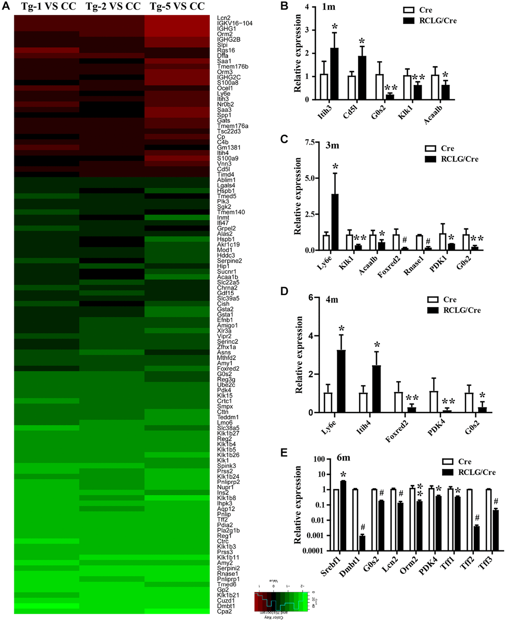 Microarray analysis showed that most of the 113 differentially expressed genes found in the liver tissues of RCLG/Alb-Cre mice were related to cellular proliferation, cell cycle, apoptosis, liver regeneration, DNA damage, stress responses, inflammation response, immune escape, defense response, acute-phase response, cellular malignant transformation, oncogenesis or cancer malignant progression, and poor prognosis. These processes are implicated in various liver pathologies including HCC [60–63].