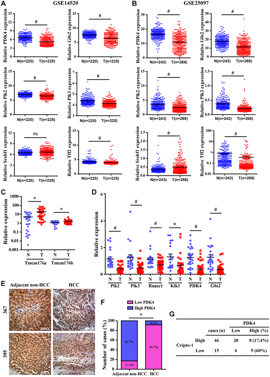 Pyruvate dehydrogenase complex (PDC) is a key modulator of tricarboxylic acid (TCA) cycle flux in the mitochondria by catalyzing the oxidation of pyruvate into acetyl CoA and NADH, which is required for the TCA cycle and mitochondrial respiration; phosphorylation of PDC is catalyzed in humans by four isozymes of pyruvate dehydrogenase kinase (PDK1, PDK2, PDK3 and PDK4) with about 70% homology [70–75]. PDKs 1–3 are closely associated with metabolism of cancer cells because they inactivate PDC via phosphorylation [73]. PDK4 acts as a potential tumor suppressor because its expression is significantly reduced in lung, ovarian, colon and breast cancers [76–78]. In this study, we demonstrated significantly decreased expression of PDK4 in the RCLG/Alb-Cre transgenic livers (Figure 6 and Supplementary Table 2) and human HCC tissue samples (Figure 7). Moreover, PDK4 silencing significantly increased proliferation, tumorigenicity and invasion of HCC cells (unpublished data). Furthermore, PDK4-/- livers showed enhanced hepatocyte growth, but these effects were inhibited by arsenic treatment [45]. Overall, our data suggested that PDK4 was a potential suppressor of hepatocarcinogenesis in mice and humans.