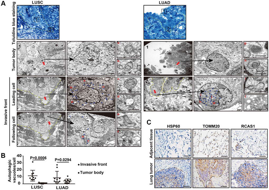 We studied autophagic flux in cancer cells at different locations in human primary non-small cell lung cancers (NSCLCs) using ultrathin-section TEM. To precisely locate the invasive front in lung cancer tissues, we prescreened resin-embedded semi-thick sections of primary human lung cancer tissues, including two squamous lung cancers (LUSC) and two lung adenocarcinomas (LUAD), by toluidine blue staining, and the invasive front region was subjected to further TEM analysis (Figure 1A). Under TEM, we observed a large number of autophagy-related structures representing different stages of autophagy, such as phagophores, autophagosomes, amphisomes, and autolysosomes in the cells at the invasive front but not in cells inside the tumor body in both LUSC tissues and LUAD tissues (Figure 1A, 1B), suggesting that cancer cells at the invasive front may undergo very fast autophagic recycling.
