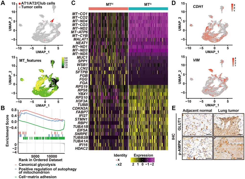 Interestingly, in these high autophagic cancer cells, less organelles including mitochondria, endoplasmic reticulum, or Golgi apparatus were observed (Figure 1A, 1B). Consistently, the heat shock protein 60 (HSP60), translocase of outer mitochondrial membrane 20 homologs (TOMM20) and the Golgi protein receptor binding cancer antigen expressed on SiSo cells (RCAS1) were less expressed at the invasive front, compared with the strong IHC signal of these proteins in the intratumoral cells (Figure 1C). Next, we evaluated the cellular functions by assessing the single-cell RNA-seq data of human primary lung cancers based on expression of mitochondria genes. We analyzed single-cell RNA-seq of six human primary LUADs including two stage I, three stage II and one stage III tumors in ArrayExpress under accessions E-MTAB-6149 and E-MTAB-6653 using the uniform manifold approximation and projection (UMAP) [17]. We removed the immune cells that expressed PTPRC/CD45, endothelial cells that expressed PECAM1/CD31, and fibroblast cells (Supplementary Figure 1) and regrouped the remaining cells using UMAP (Figure 2A, upper panel). Based on expression of mitochondria genes, cancer cells were divided into MTlo subgroup (lacking detectable expression of the mitochondria genes) and MThi subgroup (Figure 2A, lower panel and Supplementary Figure 2). Compared to MThi cancer cells, MTlo cancer cells exhibited upregulated mitophagy and glycolytic pathways, as expected, but downregulated cell-matrix adhesion pathway (Figure 2B). In addition, MTlo cancer cells expressed higher levels of SMTN1, TUBB, TUBA1A, and TUBA1B genes involved in microtubule turnover which contributes to cellular processes such as intracellular transport, cell division and migration, than MThi cancer cells did [18] (Figure 2C). Also, MTlo cells expressed high level of VIM but lack CDH1 (Figure 2D). These transcriptomic features suggest that the high autophagic MTlo cancer cells may reside in a mesenchymal state and exhibit reduced substrate-adherence while increased migration, and glycolysis. Consistently, cell surface expression of GLUT1 and phosphorylated AMPK (a protein that activate autophagy) were predominantly observed in cancer cells at the invasive front in immunostaining (Figure 2E). These collective results indicate that in human primary lung cancer tissues, invading cancer cells at the invasive front exhibit higher level of autophagic flux than cancer cells inside the tumor body.