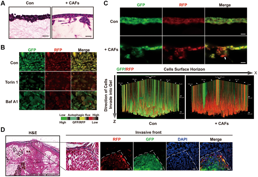 Then, we sought to develop an in vitro system to monitor autophagic flux in the invading cancer cells. To do this, we combined a live cell autophagy monitoring system with a three-dimensional (3D) organotypic invasion coculture system. Knowing that paracrine interaction between human cancer-associated fibroblasts (CAFs) and malignant cells promotes invasion of malignant cells at the tumor-stroma border [1], we seeded lung adenocarcinoma cells A549 on the surface of a dense gel composed of collagen I and Matrigel, which closely mimics the tumor-associated microenvironment, with or without human CAFs embedded in the gels. As expected, A549 cells were able to invade the gel only when CAFs were embedded. In the absence of embedded CAFs, A549 cells grew only on the top of the gel and could not invade it (Figure 3A).
