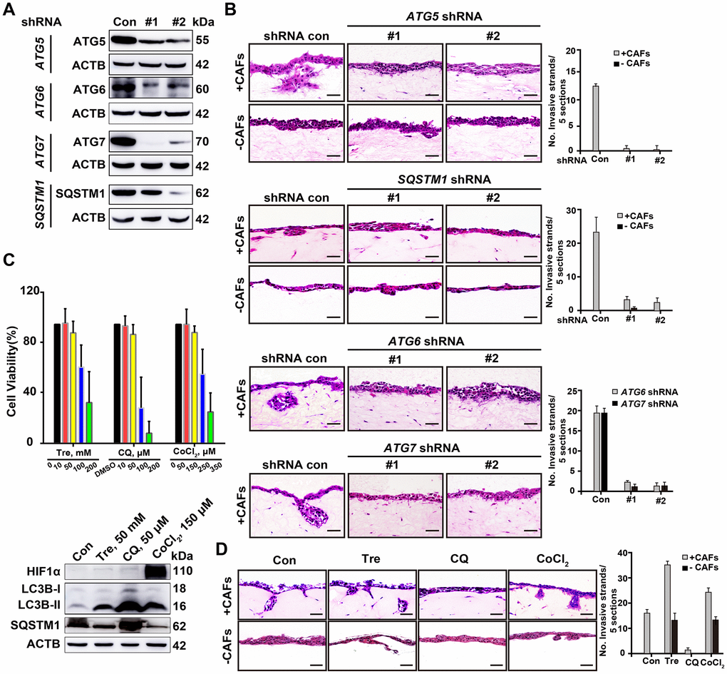 Autophagy-related genes (ATGs) including ATG5, ATG6 (also known as BECN1), ATG7, and SQSTM1 are key components involved in specific steps during autophagosome biogenesis [20]. To further evaluate the impact of autophagy on the invasive ability of cancer cells, we depleted these ATGs by shRNA-mediated knockdown and tested the changes in invasion using the 3D organotypic coculture invasion system. Inhibition of ATG6, ATG5, ATG7, or Sequestosome 1 (SQSTM1)/p62 blocks the nucleation of the autophagosome, the expansion and completion of the autophagosome membrane, and the maturation and degradation of the autophagosome membrane, respectively [16]. Interestingly, depletion of these ATGs profoundly attenuated A549 cell invasion in the presence of CAFs in the 3D organotypic coculture invasion assay (Figure 4A, 4B). Therefore, impairment of autophagic initiation or autophagic degradation in lung cancer cells decreased invasion.