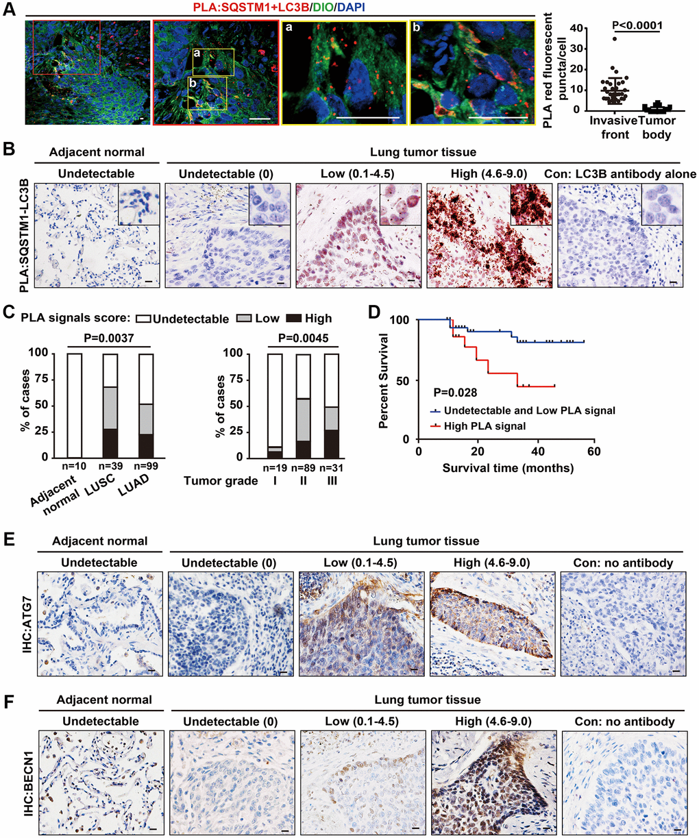 For evaluation of PLA signal score of SQSTM1-LC3B complex in tumor tissue array, we defined the PLA puncta expression patterns into an intensity score from 0-3 for quantitative evaluation as follows: score 0, no puncta or barely visible puncta in <5% of the cells; score 1, detectable puncta in 5–25% of cells; score 2, readily detectable puncta in 25–75% of cells; score 3, puncta in >75% of cells. The number of cytoplasmic PLA puncta was assessed as absent (score 0), weak (score 1), moderate (score 2) or strong (score 3). Cytoplasmic PLA signal for SQSTM1-LC3B complex was classified as low and undetectable signal for a score of 0–4.5 and high signal for a score of 4.6–9.0.