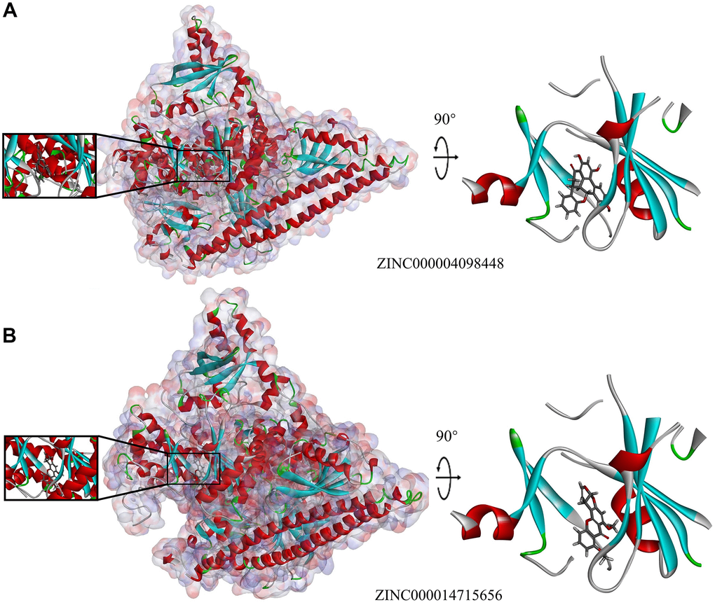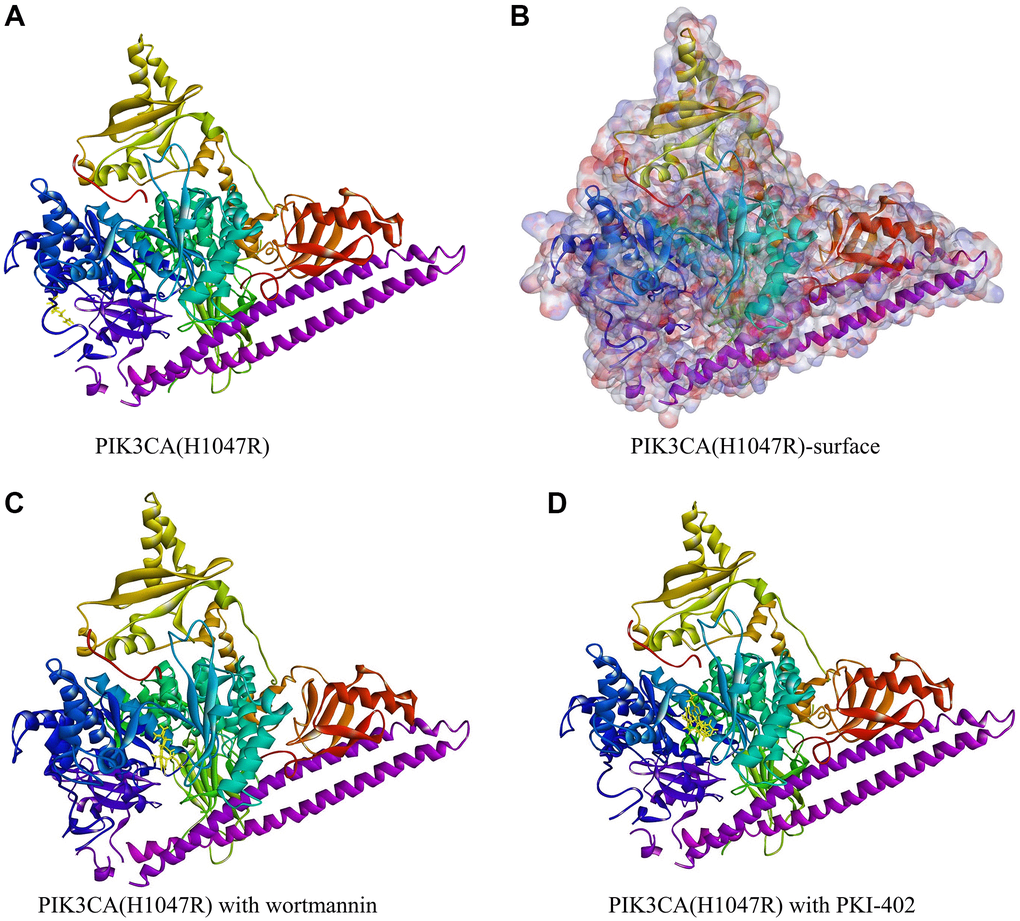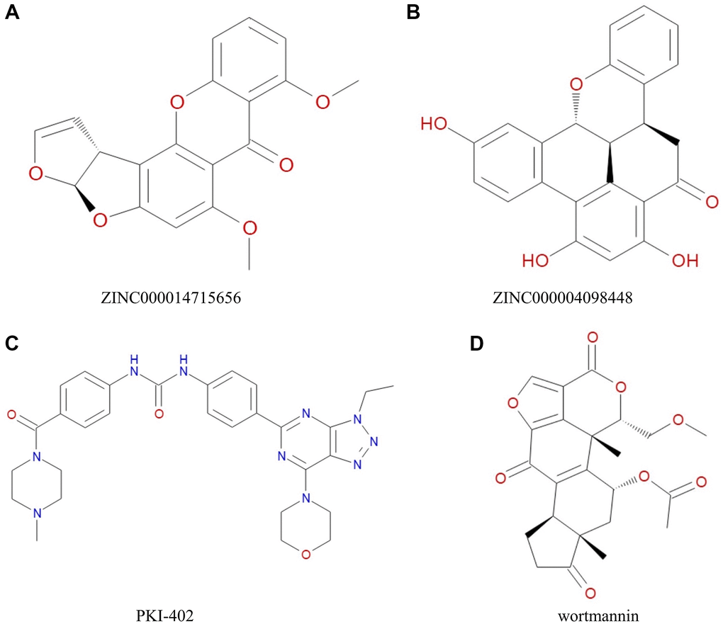 A total of 17,931 ligands were downloaded from the ZINC database. The chemical structure of PIK3CA H1047R (3HHM) was selected as the receptor to align these ligands. Of these, 2,794 compounds exhibited strong binding to PIK3CA H1047R protein. The top 20 ligands are listed in Table 1. PKI-402 (ZINC000049745945) and wortmannin (ZINC000001619592) were selected as two reference proteins (Figure 1).