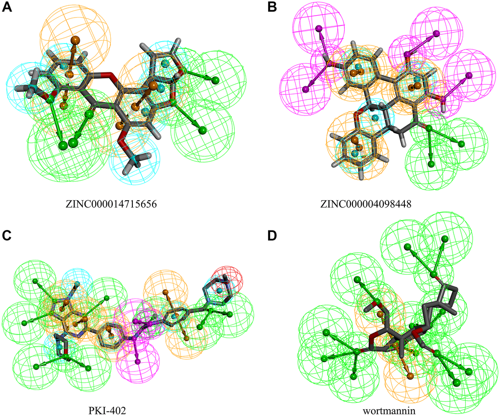 The pharmacophore study of the two candidate ligands, PKI-402, and wortmannin showed 14 features in ZINC000014715656 including 4 hydrogen bond (HB) acceptors, 6 hydrophobics, and 4 ring aromatics (Figure 3). ZINC000004098448 showed 20 features in ZINC000004098448, including 6 HB acceptors, 4 HB donors, 4 hydrophobics, and 6 ring aromatics. Wortmannin and PKI-402 showed 13 and 24 features, respectively.