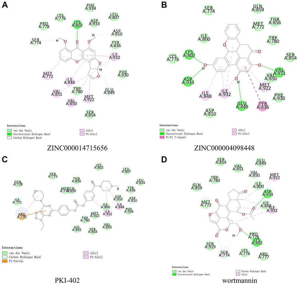 Next, we conducted structural computational studies to obtain hydrogen bonds, π-related interactions, and the charge on these ligands (Figures 4, 5 and 6). ZINC000014715656 formed 4 pairs of hydrogen bonds (Table 5) between O10 of the compound and LYS802:HZ2 of 3HHM, H26 of the compound and SER774:OG of 3HHM, H36 of the compound and ASP810:OD1 of 3HHM, and H36 of the compound and GLU849:O of 3HHM. Eight pairs of π-related interactions are listed in Table 6. In addition, ZINC000004098448 formed 4 pairs of hydrogen bonds between LYS802:HZ2 of 3HHM and O16 of the ligand, VAL851:HN of 3HHM and O25 of the ligand, H38 of the ligand and ASP933:OD1 of 3HHM, and H41 of the ligand and GLU849:O of 3HHM. Six pairs of π-related interactions, including TYR836, ILE932, ILE848, ILE932, MET922, and ILE932 of 3HHM were found with ZINC000004098448. Wortmannin exhibited 6 hydrogen bonds with 3HHM and 4 π-related interactions with 3HHM, whereas PKI-402 displayed 1 hydrogen bond with 3HHM and 4 π-related interactions with 3HHM (Tables 5 and 6).