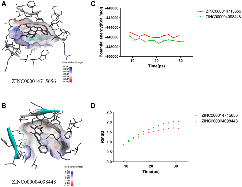 Finally, a molecular dynamics simulation model was used to calculate RMSD and potential energy and assess the stability of compound–3HHM complexes. The trajectories of both ZINC000004098448–3HHM and ZINC000014715656–3HHM complexes reached the equilibrium after 30 ps and gradually stabilized with time, implying the stability of two complexes under physiological conditions. These findings indicated that ZINC000004098448 and ZINC000014715656 could be used to develop targeted therapy for patients with TNBC harboring PIK3CA H1047R mutation.