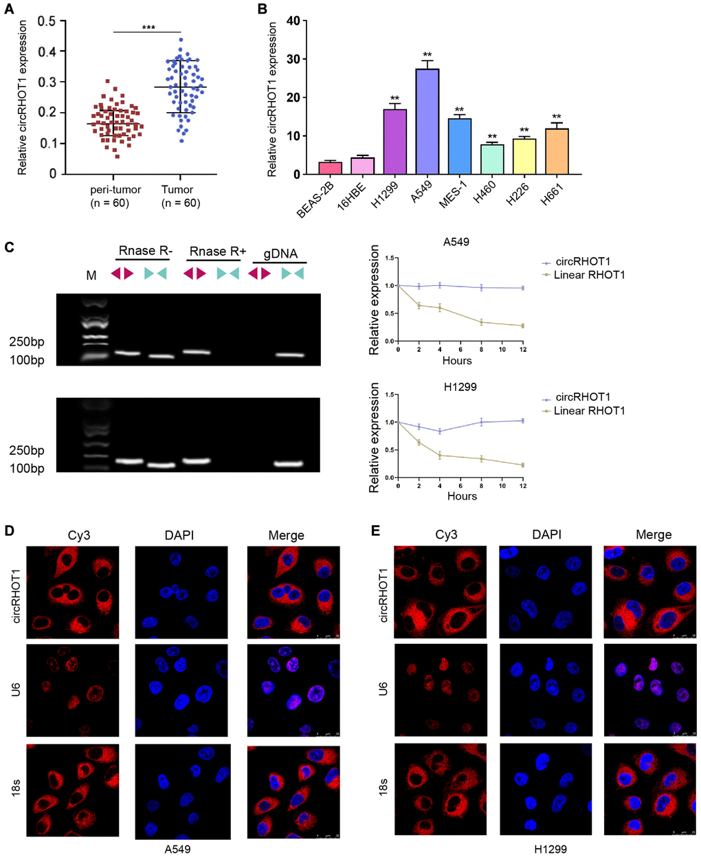 To confirm the clinical association of circRHOT1 with NSCLC, we detected the expression levels in clinical NSCLC samples. Our data demonstrated that the expression levels of circRHOT1 were elevated in the clinical tumor tissues relative to that in the peritumor tissues from NSCLC patients (Figure 1A). Then, we observed that the expression of circRHOT1 was enhanced in human lung cancer cell lines, including MES-, H226, 16HBE, H460, H661, H1299 and A549 cells, compared with normal human lung epithelial cell line BEAS-2B cell lines (Figure 1B). We identified that H1299 and A549 cells presented higher expression of circRHOT1 in the cell lines, and H1299 and A549 cells were selected to use in the subsequent analysis. We observed that circRHOT1, but not RHOT1, was detectable using divergent primers with the treatment of RNase R (Figure 1C) and the RHOT1 linear form was not observed using convergent primer. FISH assays revealed that circRHOT1 was mainly localized in cytoplasm fraction in H1299 and A549 cells (Figure 1D and 1E).