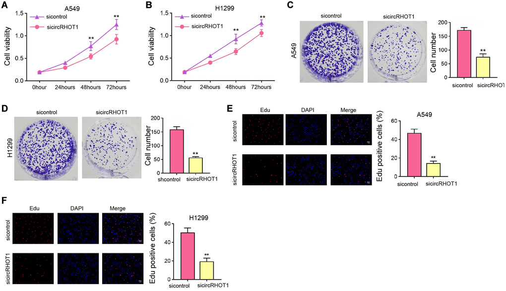 We then evaluated the function of circRHOT1 in mediating NSCLC cell proliferation in H1299 and A549 cells by silencing circRHOT1 expression using siRNA. MTT assays showed that the silencing of circRHOT1 repressed cell viabilities of H1299 and A549 cells (Figure 2A and 2B). Meanwhile, the depletion of circRHOT1 significantly reduced colony formation numbers of H1299 and A549 cells (Figure 2C and 2D). Similarly, the Edu-positive cells were decreased by circRHOT1 knockdown in H1299 and A549 cells (Figure 2E and 2F).