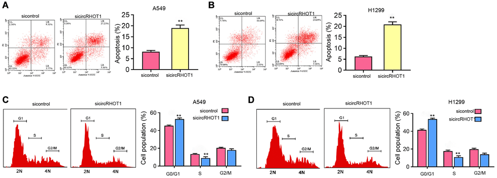 We further assessed the effect of circRHOT1 on NSCLC cell apoptosis and cell cycle processes in vitro. We found that the silencing of circRHOT1 enhanced the apoptosis of H1299 and A549 cells (Figure 3A and 3B). Moreover, we observed that the proportion of G0/G1 cells was increased while S phase cells were inhibited by the depletion of circRHOT1 in H1299 and A549 cells (Figure 3C and 3D), indicating that circRHOT1 depletion induces NSCLC cell apoptosis and cell cycle arrest in vitro.