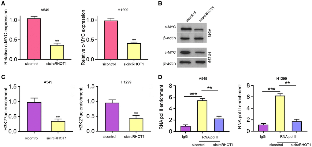 Mechanical investigation identified that the depletion of circRHOT1 remarkably reduced c-MYC mRNA and protein expression in H1299 and A549 cells (Figure 4A and 4B). Moreover, the silencing of circRHOT1 repressed the enrichment of transcription active marker histone H3 lysine 27 acetylation (H3K27ac) on the c-MYC promoter (Figure 4C). Consistently, the enrichment of RNA polymerase II on the promoter of c-MYC was reduced by circRHOT1 knockdown in H1299 and A549 cells (Figure 4D).