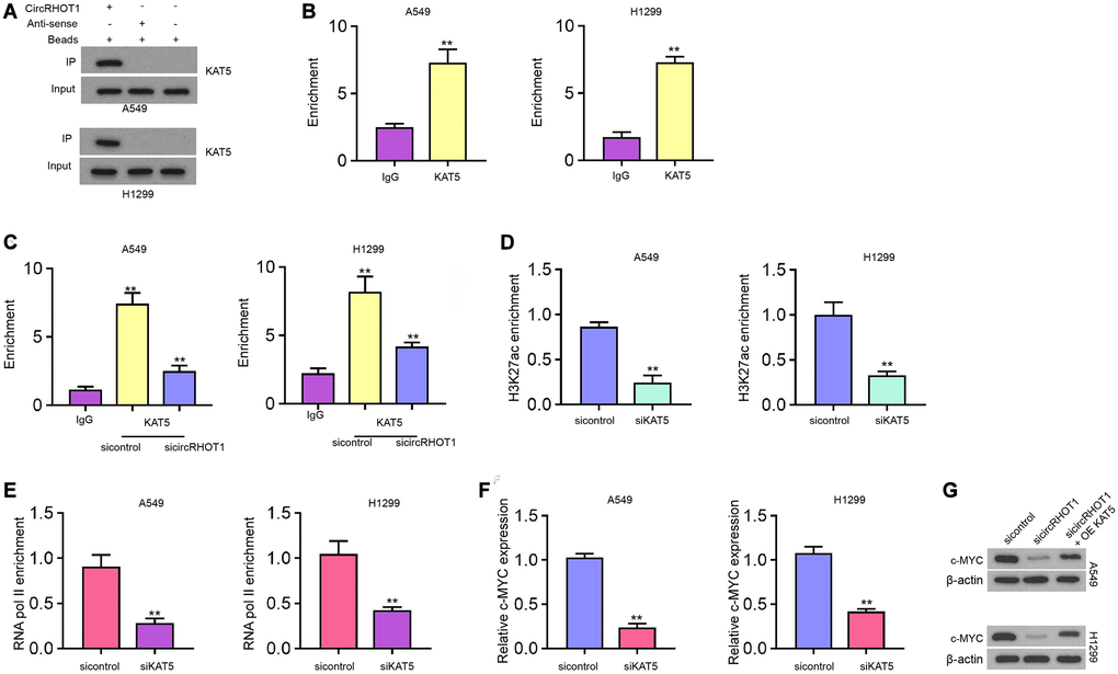 Next, we further explored the underlying mechanism of circRHOT1-mediated epigenetic modification of c-MYC. RNA pull down analysis showed that circRHOT1 was able to directly interact with acetyltransferase KAT5 in H1299 and A549 cells (Figure 5A). Meanwhile, we observed that KAT5 could bind to c-MYC promoter in H1299 and A549 cells (Figure 5B). The silencing of circRHOT1 significantly impaired the enrichment of KAT5 on the c-MYC promoter in H1299 and A549 cells (Figure 5C). Moreover, the depletion of KAT5 reduced the enrichment of H3K27ac and RNA polymerase II on the c-MYC promoter (Figure 5D and 5E). Consistently, the inhibition of KAT5 reduced c-MYC expression in H1299 and A549 cells (Figure 5F). The depletion of circRHOT1 down-regulated c-MYC expression, while KAT5 overexpression could reverse this down-regulation in H1299 and A549 cells (Figure 5G).