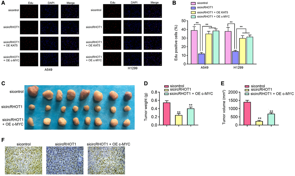 Next, we validated the effect of circRHOT1/c-MYC signaling on NSCLC cell proliferation in vitro and in vivo. Edu assays showed that the silencing of circRHOT1 reduced cell proliferation of H1299 and A549 cells, in which the overexpression of c-MYC or KAT5 could rescued the reduction in the cells (Figure 6A and 6B). Tumorigenicity analysis in nude mice further proved that the depletion of circRHOT1 attenuated A549 cell growth in vivo, while the overexpression of c-MYC was able to reverse this effect (Figure 6C–6E). The levels of ki-67 was decreased by circRHOT1 knockdown and c-MYC overexpression rescued the levels in the tumor tissues (Figure 6F).