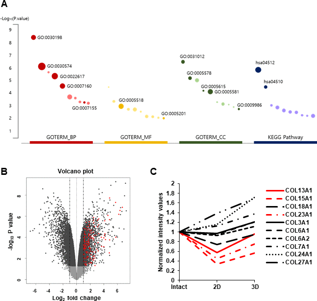 To compare the transcriptional profiles of 2D cultured DPCs and 3D cultured spheroid DPCs, microarray data (GSE44765) were used from the National Center for Biotechnology Information Gene Expression Omnibus database. For bioinformatic analysis, data were processed with R studio using Limma package. Uncharacterized and undefinable genes were deleted from the list. Genes that were upregulated > ***log2 (fold change) > 1.5***, adjusted p < 0.01 were considered statistically significant for upregulated DEGs.
