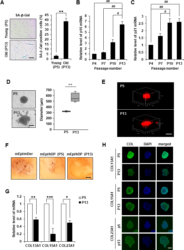 DPCs tend to aggregate, which is related to the hair inductivity of DPCs. Therefore, DPCs need to be cultured in 3D culture to create mimetic physiological cell state [6]. This study was investigated whether collagen expression changes in hDPCs are involved in the spheroid formation and hair inductivity of hDPCs and further examined the underlying molecular mechanism of collagen regulation. The expression of diverse collagen, such as COL13A1 and COL15A1, was upregulated in 3D compared to 2D cultured hDPCs. Their expression was also downregulated during aging. In addition, COL13A1 and COL15A1 were expressed in the DP region of young mice (4 weeks and 7 weeks) HF, and this expression in DPC was decreased in old mice (21 months). Blocking of COL13A1 and COL15A1 by siRNA reduced aggregative behavior and induced senescence of hDPCs in vitro. Further, TGF-β2 played a key role in COL13A1 and COL15A1 regulation. TGF-β2 upregulated collagen levels, delayed cellular senescence, and induced aggregation capacity in hDPCs.