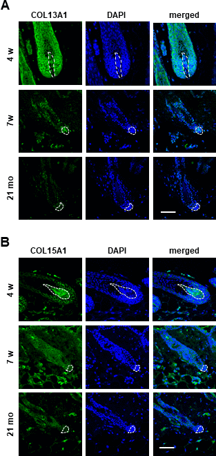 Further, significant downregulation of COL13A1, COL15A1, and COL23A1 mRNA levels (Figure 2G) compared to COL3A1, COL6A1, COL6A2, COL7A1, COL18A1, COL24A1, and COL27A1 (Supplementary Figure 1E) was confirmed in senescent hDPC spheroids. However, immunostaining results showed that the levels of COL13A1 and COL15A1 protein expression were decreased in 3D spheroids of senescent hDPCs but not COL23A1 (Figure 2H and Supplementary Figure 1F). We confirmed that COL13A1 and COL15A1 expression was reduced in senescent hDPCs through western blot (Supplementary Figure 1G). Because the expression levels of COL13A1 and COL15A1 were decreased in senescent hDPCs, COL13A1 and COL15A1 expression in HF of young (4 and 7 weeks) and old (21 months) mice was investigated. Aged HFs were positive for senescence-associated β-gal (SA-β-gal) at the secondary germ and DP of the telogen HF (Supplementary Figure 2), indicating HF senescence. The expression levels of COL13A1 and COL15A1 were significantly decreased in DP of aged mice (Figure 3A, 3B). These results indicated that senescence of DPCs is associated with low expression levels of COL13A1 and COL15A1.