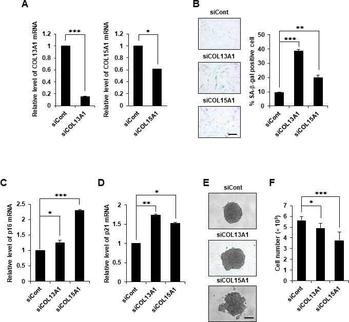 Total cellular RNA was extracted using Invitrogen TRIzol reagent (Thermo Fisher Scientific), followed by reverse transcription using a cDNA synthesis kit (Nanohelix, Daejeon, Korea). qRT-PCR was performed using the StepOne Real-Time PCR System (Applied Biosystems/Thermo Fisher Scientific). The primer sequences used are as follows (forward and reverse, respectively): 5′-TGGAGAACAGGGACCAGATGGC-3′ and 5′-GATCTCCTGGAGAGCCTCATTG-3′ for COL13A1, 5′-GGTGACACTGGTTTACCTGGCT-3′ and 5′-GCCTTTCCAGAGGAATGTCCTC-3′ for COL15A1, 5′-CTCGTGCTGATGCTACTGAGGA-3′ and 5′-GGTCGGCGCAGTTGGGCTCC-3′ for p16, and 5′-AGGTGGACCTGGAGACTCTCAG-3′ and 5′-TCCTCTTGGAGAAGATCAGCCG-3′ for p21.