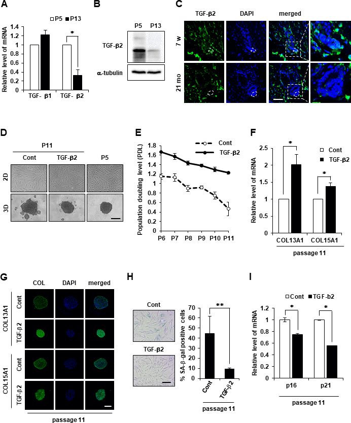 It was hypothesized that TGF-βs may contribute to COL13A1 and COL15A1 expression. The downregulation of TGF-β2 mRNA was also detected in senescent hDPCs, whereas no significant change in TGF-β1 mRNA expression was found (Figure 5A). The level of TGF-β2 protein was also downregulated in senescent hDPCs (Figure 5B). A significantly lower level of TGF-β2 was detected in the DP region of aged HF (21 months) compared to young mice HFs (7 weeks; Figure 5C). Next, to investigate whether TGF-β2 supplement could induce compact 3D spheroids of hDPCs even in old passage, hDPCs have been cultured with or without TGF-β2 from P5 to P11. TGF-β2 treatment in hDPCs not only increased cell proliferation evidenced by population doubling but also restored the aggregative ability of hDPCs to the level of young cells (Figure 5D, 5E). The mRNA and protein expression levels in aged hDPCs were examined to further verify whether collagen expression was regulated by TGF-β2. Both mRNA and protein levels of COL13A1 and COL15A1 were upregulated by TGF-β2 treatment in aged DPCs (Figure 5F, 5G, and Supplementary Figure 4A, 4B). It was also investigated whether TGF-β2 treatment could recover aged DPCs to young phenotype. Indeed, TGF-β2 treatment reduced the senescent phenotype of hDPCs as evidenced by β-gal activity and p16 and p21 expression (Figure 5H, 5I). These results indicated that TGF-β2 signaling plays a role in aggregative ability and anti-aging of hDPCs by regulating COL13A1 and COL15A1 expression. Next, we investigated whether delaying the aging of hDPC by treatment with TGF-β2 can promote hair growth. We found that injection of naïve (untreated) hDPCs (P12) increased telogen-to-anagen induction in mice only slightly following subcutaneous injection, while TGF-β2-treated hDPCs (P12) induced robust hair growth (Supplementary Figure 4C, 4D). Hair growth by TGF-β2-treated hDPC (P12) was similar to that of naïve young hDPC (P5). This result suggested that delayed aging of hDPC by TGF-β2 treatment restored the hair growth effect of hDPC to a youthful state.