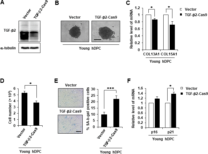 Next, it was confirmed whether TGF-β2 inhibition accelerated the aging-related phenotype. CRISPR/Cas9-mediated TGF-β2 KO was performed in early-passage hDPCs, and CRISPR/Cas9-mediated TGF-β2 KO was confirmed (Figure 6A). The 3D spheroid formation assay revealed that TGF-β2 KO reduced the aggregative behavior and cell growth of hDPCs and downregulated COL13A1 and COL15A1 expression (Figure 6B–6D). TGF-β2 KO also induced the senescent phenotype as evidenced by a substantial increase of β-gal activity and p21 mRNA upregulation (Figure 6E, 6F).